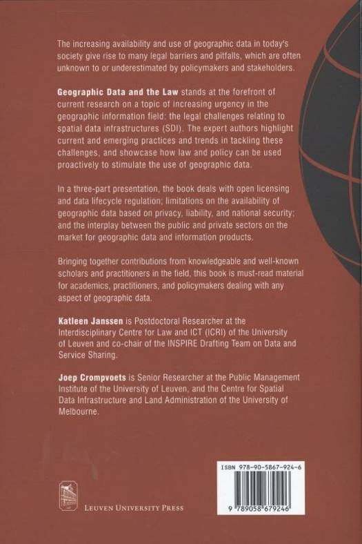 The increasing availability and use of geographic data in today's society give rise to many legal barriers and pitfalls, which are often unknown to or underestimated by policymakers and stakeholders. Geographic Data and the Law stands at the forefront of current research on a topic of increasing urgency in the geographic information field: the legal challenges relating to spatial data information (SDI).