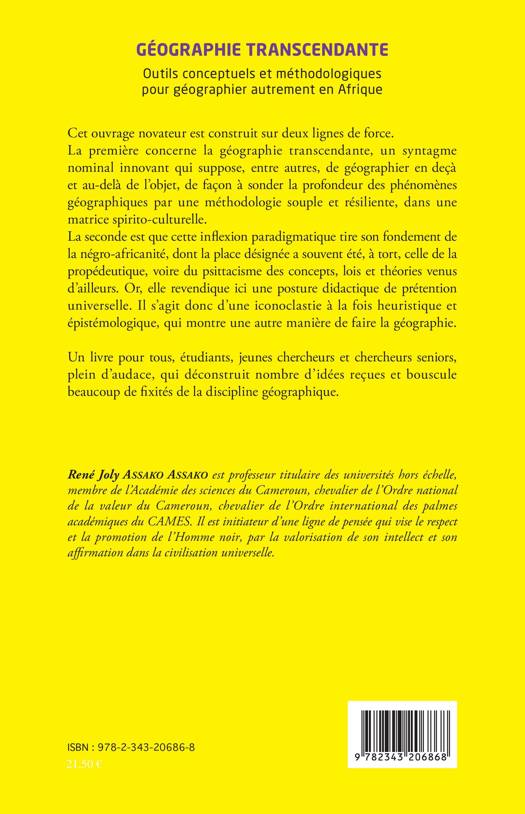 Cet ouvrager est construit sur deux lignes de force. La première concerne la géographie transcendante, un syntagme nominal innovant qui suppose, entre autres, de géographier en deçà et au-delà de l'objet, de façon à sonder la profondeur des phénomènes géographiques par une méthodologie souple et résiliente, dans une matrice spirito-culturelle. La seconde est que cette inflexion paradigmatique tire son fondement de la négro-africanité, dont la place désignée a souvent été, à tort, celle de la propédeutique, voire du psittacisme des concepts, lois et théories venus d'ailleurs. Or, elle revendique ici une posture didactique de prétention universelle. Il s'agit donc d'une iconoclastie à la fois heuristique et épistémologique, qui montre une autre manière de faire la géographie.