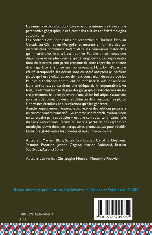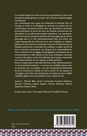 Ce numéro explore la notion de sacré conjointement à travers une perspective géographique et à partir des cultures et épistémologies autochtones. Les contributions sont issues de recherches au Burkina Faso, au Canada, au Chili et en Mongolie, et mettent en lumière des caractéristiques communes. Autant dans ses dimensions matérielles qu'immatérielles, le sacré est pour les Peuples autochtones une disposition et un phénomène spatial englobants. Les représentations de la nature sont partie prenante de cette approche et encore davantage face à la crise environnementale. Mais, loin d'être une réalité atemporelle, les déclinaisons du sacré analysées ici révèlent plutôt qu'il est évolutif et socialement construit. Il demeure que les Peuples autochtones continuent de mobiliser la valeur sacrée de leurs territoires, construisant une éthique de la responsabilité. Au final, un élément fort se dégage des géographies autochtones du sacré présentées ici: elles relèvent d'une vision holistique, s'attachant non pas à des objets ou des sites délimités dans l'espace, mais plutôt à de vastes étendues et aux relations qu'elles génèrent. Ainsi, le respect envers l'ensemble des lieux et des relations propres à un environnement humanisé - vu comme une véritable maison, sinon un sanctuaire par ces peuples - est une composante fondamentale du sacré autochtone. L'étude du sacré à partir de ces espaces et ontologies ouvre donc des perspectives prometteuses pour rétablir l'équilibre global entre les sociétés et leurs milieux de vie.