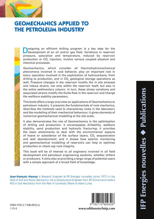 Designing an efficient drilling program is a key step for thedevelopment of an oil and/or gas field. Variations in reservoirpressure, saturation and temperature, induced by reservoirproduction or CO2 injection, involve various coupled physical andchemical processes.Geomechanics, which consider all thermohydromechanicalphenomena involved in rock behavior, play an important role inevery operation involved in the exploitation of hydrocarbons, fromdrilling to production, and in CO2 geological storage operations aswell. Pressure changes in the reservoir modify the in situ stressesand induce strains, not only within the reservoir itself, but also inthe entire sedimentary column. In turn, these stress variations andassociated strains modify the fluids flow in the reservoir and changethe wellbore stability parameters.This book offers a large overview on applications of Geomechanics topetroleum industry. It presents the fundamentals of rock mechanics,describes the methods used to characterise rocks in the laboratoryand the modelling of their mechanical behaviour; it gives elements ofnumerical geomechanical modelling at the site scale.It also demonstrates the role of Geomechanics in the optimisationof drilling and production: it encompasses drillability, wellborestability, sand production and hydraulic fracturing; it providesthe basic attainments to deal with the environmental aspectsof heave or subsidence of the surface layers, CO2 sequestrationand well abandonment; and it shows how seismic monitoringand geomechanical modelling of reservoirs can help to optimiseproduction or check cap rock integrity.This book will be of interest to all engineers involved in oil fielddevelopment and petroleum engineering students, whether drillersor producers. It aims also at providing a large range of potential userswith a simple approach of a broad field of knowledge.