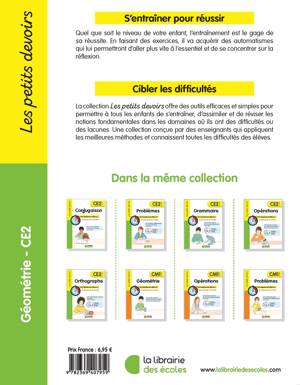 Un entraînement efficace est un gage de réussite : grâce aux séances minutées des Petits devoirs, l'objectif de chaque série d'exercices est clairement formulé, et la progression est conçue par des enseignants expérimentés pour qu'il soit atteint quel que soit le niveau de votre enfant. Pour chaque notion, la série d'exercices est précédée d'une leçon brève et claire. Tous les exercices sont corrigés. Le cahier propose des mémos (conjugaisons, tables de multiplication...) très pratiques sur le verso de la couverture.