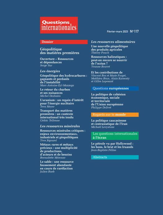 Invasion de l'Ukraine, dépendance énergétique de l'Union européenne, insécurité alimentaire en Afrique, préservation de l'environnement… la question des matières premières est au cœur de l'actualité. Ce numéro de Quesions internationales étudie les principaux enjeux géopolitiques, économiques et environnementaux. L'exploitation, la transformation et la commercialisation des ressources naturelles attisent en effet les convoitises de nombreux acteurs (Etats, entrerprises, ONG, intermédiaire ect.).