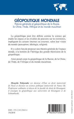 GÉOPOLITIQUE MONDIALE Théorie générale et géopolitique de la Russie, la Chine, l'Inde, l'Afrique et du monde musulman La géopolitique peut être définie comme la science qui étudie les enjeux et les rivalités de pouvoirs sur les territoires, impliquant les acteurs internes ou externes, selon leur vision du monde (perception, idéologie, religion). Il y a alors lieu de proposer une théorie générale de l'espace monde, à la lumière de l'héritage des grands théoriciens de la géopolitique. Ainsi prend corps la géopolitique de la Russie, de la Chine, de l'Inde, de l'Afrique et du monde musulman.