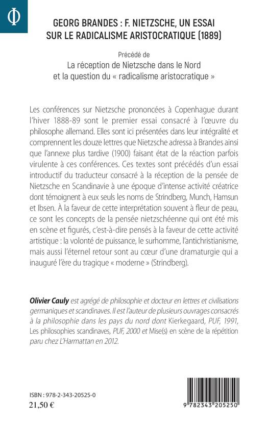 Ces conférences prononcées à Copenhague en 1888-89 sont le premier essai consacré à l'oeuvre de Nietzsche. Elles sont ici présentées dans leur intégralité et comprennent les douze lettres que Nietzsche adressa à Brandes ainsi que l'annexe de 1900 faisant état de la virulence des réactions. Ces textes sont précédés d'un essai introductif consacré à la réception de Nietzsche en Scandinavie parmi les créateurs (Strindberg, Munch, Hamsun et Ibsen). À la faveur de cette interprétation, les concepts nietzschéens ont été mis en scène et figurés, c'est-à-dire pensés à la faveur de l'activité artistique : la volonté de puissance, le surhomme, l'antichristianisme, mais aussi l'éternel retour sont au coeur d'une dramaturgie qui a inauguré l'ère du tragique « moderne » (Strindberg).