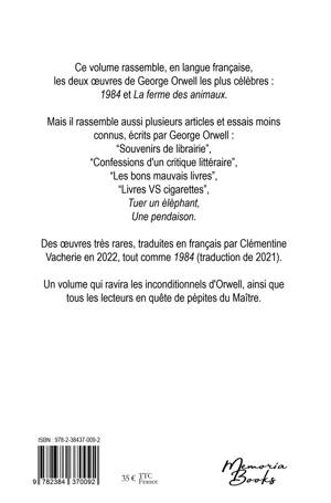 Ce volume rassemble, en langue française, les deux oeuvres de George Orwell les plus célèbres: 1984 et La ferme des animaux. Mais il rassemble aussi plusieurs articles et essais moins connus, écrits par George Orwell: Souvenirs de librairie, Confessions d'un critique littéraire, Les bons mauvais livres, Livres VS cigarettes, Tuer un éléphant et Une pendaison. Des oeuvres très rares, traduites en français par Clémentine Vacherie en 2022, tout comme 1984 (traduction de 2021). Un volume qui ravira les inconditionnels d'Orwell, ainsi que tous les lecteurs en quête de pépites du Maître.