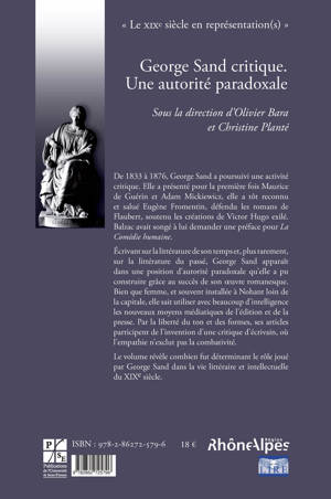 Écrivant sur la littérature de son temps et, plus rarement, sur la littérature du passé, George Sand apparaît dans une position d'autorité paradoxale qu'elle a pu construire grâce au succès de son ouvre romanesque. Bien que femme, et souvent installée à Nohant loin de la capitale, elle sait utiliser avec beaucoup d'intelligence les nouveaux moyens médiatiques de l'édition et de la presse. Par la liberté du ton et des formes, ses articles participent de l'invention d'une critique d'écrivain, où l'empathie n'exclût pas la combativité.