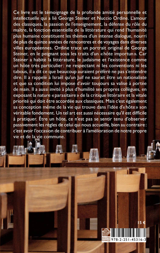 Ce livre est le temoignage de la profonde amitie personnelle et intellectuelle qui a lie George Steiner et Nuccio Ordine. L'amour des classiques, la passion de l'enseignement, la defense du role du maitre, la fonction essentielle de la litterature qui rend l'humanite plus humaine constituent les themes d'un intense dialogue, nourri de plus de quinze annees de rencontres et de voyages dans diverses villes europeennes. Ordine trace un portrait original de George Steiner, en le peignant sous les traits d'un hote importun. Car Steiner a habite la litterature, le judaisme et l'existence comme un hote tres particulier: ne respectant ni les conventions ni les tabous, il a dit ce que beaucoup auraient prefere ne pas s'entendre dire. Il a rappele a Israel qu'un Juif ne saurait etre un nationaliste et que sa condition lui impose d'avoir toujours sa valise a portee de main. Il a aussi invite a plus d'humilite ses propres collegues, en exposant la nature parasitaire de la critique litteraire et la vitale priorite qui doit etre accordee aux classiques. Mais c'est egalement sa conception meme de la vie qui trouve dans l'idee d'hote son veritable fondement. Un tel art est aussi necessaire qu'il est difficile a pratiquer. Etre un hote, ce n'est pas se sentir tenu d'observer passivement les regles de celui qui nous accueille, bien au contraire: c'est avoir l'occasion de contribuer a l'amelioration de notre propre vie et de la vie commune.