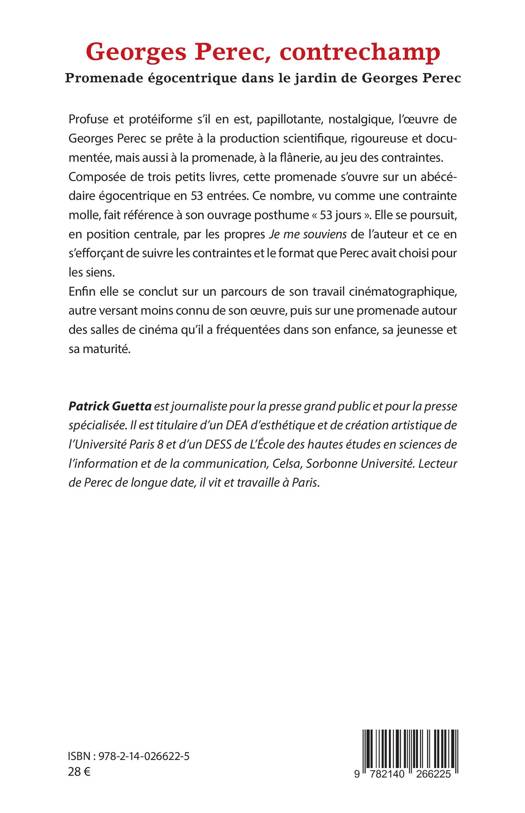 Profuse et protéiforme s'il en est, papillotante, nostalgique, l'oeuvre de Georges Perec se prête à la production scientifique, rigoureuse et documentée, mais aussi à la promenade, à la flânerie, au jeu des contraintes. Composée de trois petits livres, cette promenade s'ouvre sur un abécédaire égocentrique en 53 entrées. Ce nombre, vu comme une contrainte molle, fait référence à son ouvrage posthume « 53 jours ». Elle se poursuit, en position centrale, par les propres Je me souviens de l'auteur et ce en s'efforçant de suivre les contraintes et le format que Perec avait choisi pour les siens. Enfin elle se conclut sur un parcours de son travail cinématographique, autre versant moins connu de son oeuvre, puis sur une promenade autour des salles de cinéma qu'il a fréquentées dans son enfance, sa jeunesse et sa maturité.