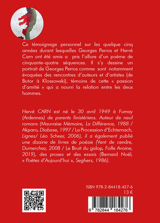 Ce témoignage personnel sur les cinq années durant lesquelles Georges Perros et Hervé Carn ont été amis a pris l'allure d'un poème de cinquante-quatre séquences. Il s'y dessine un portrait de Georges Perros comme sont notamment évoquées des rencontres d'auteurs et d'artistes (de Butor à Klossowski), témoins de cette « passion d'amitié » qui a nourri la relation entre les deux hommes.