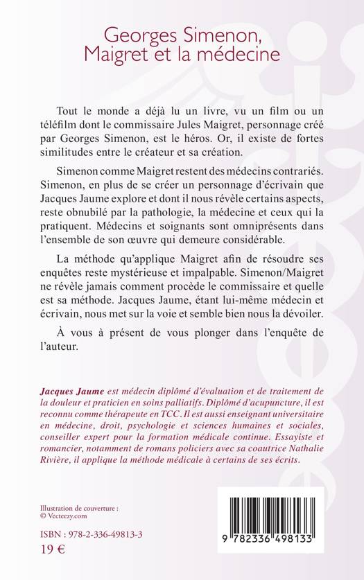 Tout le monde a déjà lu un livre, vu un film ou un téléfilm dont le commissaire Jules Maigret est le héros, personnage créé par Georges Simenon. Or, il existe de fortes similitudes entre le créateur et sa création. Simenon comme Maigret restent des médecins contrariés. Simenon, en plus de se créer un personnage d'écrivain que Jacques Jaume explore et dont il nous révèle certains aspects, reste obnubilé par la pathologie, la médecine et ceux qui la pratiquent. Médecins et soignants sont omniprésents dans l'ensemble de son oeuvre qui demeure considérable. La méthode qu'applique Maigret afin de résoudre ses enquêtes reste mystérieuse et impalpable. Simenon/Maigret ne révèle jamais comment procède le commissaire et quelle est sa méthode. Jacques Jaume, étant lui-même médecin et écrivain, nous met sur la voie et semble bien nous la dévoiler. À vous à présent de vous plonger dans l'enquête de l'auteur.