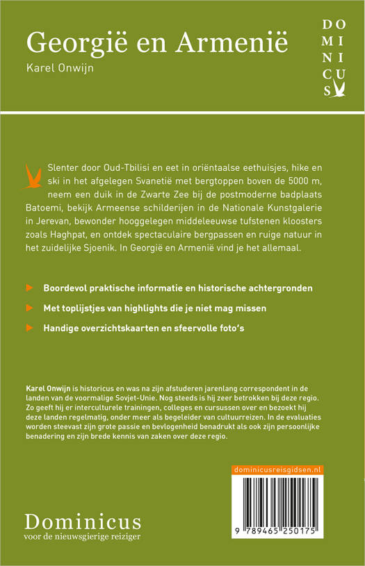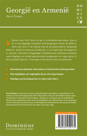 Ontdek Georgië en Armenië op vakantie met deze Dominicus-reisgids en verken de hoogste bergtoppen van Europa, maak kennis met de meest gastvrije mensen ter wereld en ontdek de oudste bouwwerken uit de christelijke cultuur. Ga op jeepsafari, maak wandel- en klimtochten naar nog nauwelijks betreden bergtoppen, bezoek middeleeuwse kloosters en ontspan in thermen uit de tsarentijd. Besteed een heerlijke dag aan een van de fantastische Georgische stranden van de Zwarte Zee, of vermaak je in de kosmopolitische hoofdsteden: het romantische Tbilisi en het luxe Jerevan. Deze reisgids staat bomvol praktische informatie, handige overzichtskaarten, sfeervolle foto's, historische achtergronden en uitgebreide culturele achtergrondinformatie. Bovendien zijn Dominicus-reisgidsen altijd up-to-date en geschreven door Nederlandstalige experts.