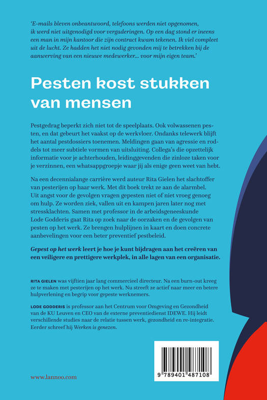 Na een decennialange carrière werd auteur Rita Gielen het slachtoffer van pesterijen op haar werk. Met dit boek trekt ze aan de alarmbel. Uit angst voor de gevolgen vragen gepesten niet of niet vroeg genoeg om hulp. Ze worden ziek, vallen uit en kampen jaren later nog met stressklachten. Samen met professor in de arbeidsgeneeskunde Lode Godderis gaat Rita op zoek naar de oorzaken en de gevolgen van pesten op het werk. Ze brengen hulplijnen in kaart en doen concrete aanbevelingen voor een beter preventief pestbeleid.