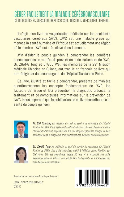 Il s’agit d’un livre de vulgarisation médicale sur les accidents vasculaires cérébraux (AVC). L AVC est une maladie grave qui menace la santé humaine et l’Afrique est actuellement une région où le nombre d AVC est très élevé dans le monde. Afin d’aider le peuple guinéen à comprendre les dernières connaissances en matière de prévention et de traitement de l AVC, Dr. ZHANG Tong et Dr.GUO Wei, les membres de la 29e Mission Médicale Chinoise en Guinée, ont traduit en français ce livre qui est rédigé par des neurologues de l’Hôpital Tiantan de Pékin. Ce livre, illustré et facile à comprendre, présente de manière question-réponse les concepts fondamentaux de l AVC, les facteurs de risque et leur prévention, le diagnostic précoce, le traitement et de nombreuses informations sur la prévention de l AVC. Nous espérons que la publication de ce livre contribuera à la santé du peuple guinéen.