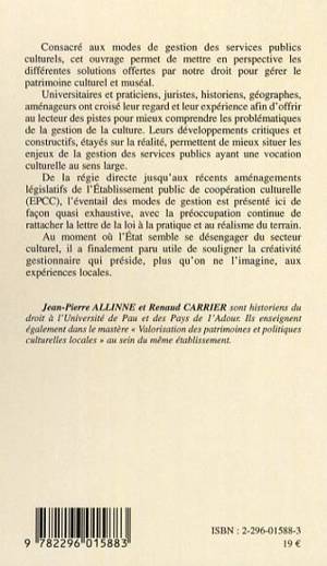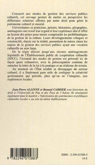 Cet ouvrage met en perspective les différentes solutions offertes par notre droit pour gérer le patrimoine culturel et muséal. De la régie directe aux récents aménagements législatifs de l'Etablissement public de coopération culturelle, l'éventail des modes de gestion est présenté ici de façon quasi exhaustive, avec la préoccupation continue de rattacher la lettre de la loi à la pratique et au réalisme du terrain. Au moment où l'Etat semble se désengager du secteur culturel, il paraît utile de souligner la créativité gestionnaire qui préside, plus qu'on ne l'imagine, aux expériences locales.