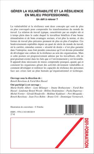 La vulnérabilité et la résilience sont deux concepts qui sont de plus en plus convoqués pour comprendre le monde du travail. La relation de travail typique, caractérisée par un emploi sûr, n'est plus la norme. Ce bouleversement où la carrière n'est plus garantie dans l'entreprise, fait prendre conscience qu'il est devenu primordial de développer une culture de la résilience au sein des organisations. Il est donc nécessaire de comprendre pourquoi et comment les organismes gérant des activités deviennent vulnérables et comment développer les capacités de résilience des personnes.