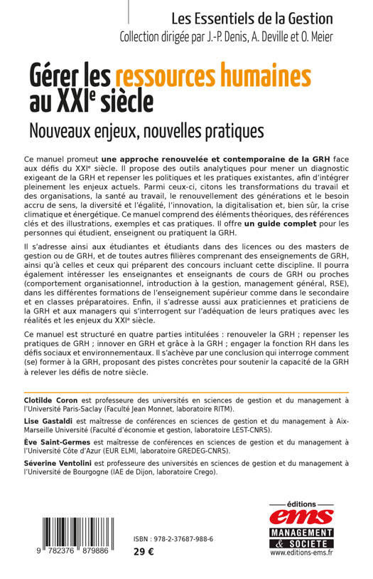 Ce manuel promeut une approche renouvelée et contemporaine de la GRH face aux défis du XXIe siècle. Il propose des outils analytiques pour mener un diagnostic exigeant de la GRH et repenser les politiques et les pratiques existantes, afin d’intégrer pleinement les enjeux actuels. Parmi ceux-ci, citons les transformations du travail et des organisations, la santé au travail, le renouvellement des générations et le besoin accru de sens, la diversité et l’égalité, l’innovation, la digitalisation et, bien sûr, la crise climatique et énergétique. Ce manuel comprend des éléments théoriques, des références clés et des illustrations, exemples et cas pratiques. Il offre un guide complet pour les personnes qui étudient, enseignent ou pratiquent la GRH.