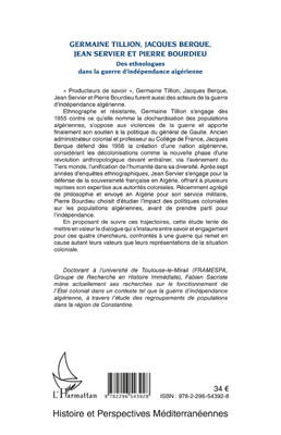 "Producteurs de savoir", Germaine Tillion, Jacques Berque, Jean Servier et Pierre Bourdieu furent aussi des acteurs de la guerre d'indépendance algérienne. En proposant de suivre ces trajectoires, cette étude tente de mettre en valeur le dialogue qui s'instaure entre savoir et engagement pour ces quatre chercheurs, confrontés à une guerre qui remet en cause autant les valeurs que leurs représentations de la situation coloniale.
