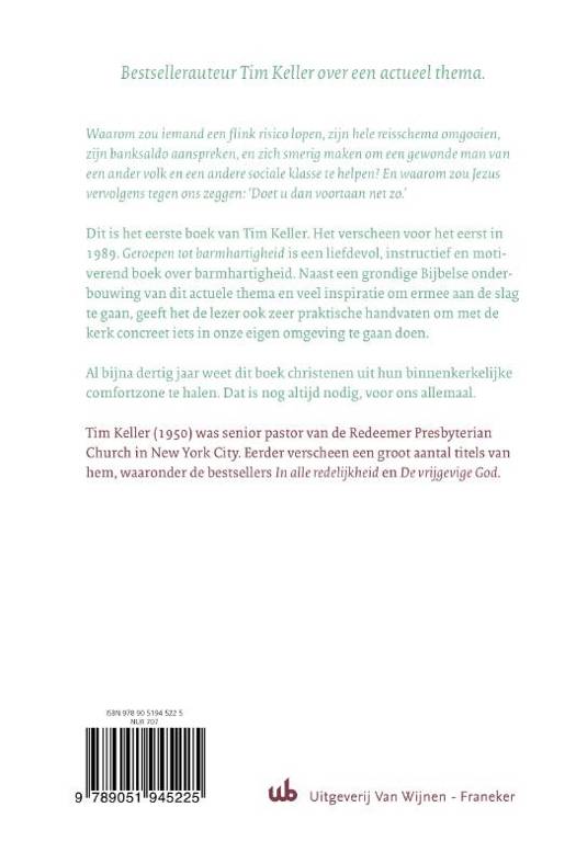 Waarom zou iemand gevaar lopen, zijn schema omgooien, zijn banksaldo opgebruiken, en zich smerig maken om een gewonde man van een ander volk en andere sociale klasse te helpen? En waarom zou Jezus tegen ons zeggen: 'Doet u dan voortaan net zo.' Dit is het eerste boek van Tim Keller. Het verscheen voor het eerst in 1989. 'Geroepen tot barmhartigheid' is een liefdevol, instructief en motiverend boek over barmhartigheid. Naast een grondige Bijbelse onderbouwing en inspiratie om met het thema aan de slag te gaan, levert het de lezer ook zeer praktische handvaten om met de kerk echt iets in onze eigen omgeving te gaan doen. Al bijna dertig jaar weet dit boek christenen uit hun binnenkerkelijke comfortzone te halen. Dat is nog altijd nodig, voor ons allemaal.