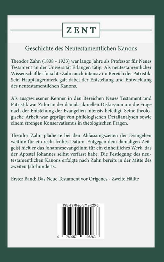 Theodor Zahn (1838 - 1933) war lange Jahre als Professor für Neues Testament an der Universität Erlangen tätig. Als neutestamentlicher Wissenschaftler forschte Zahn auch intensiv im Bereich der Patristik. Sein Hauptaugenmerk galt dabei der Entstehung und Entwicklung des neutestamentlichen Kanons.