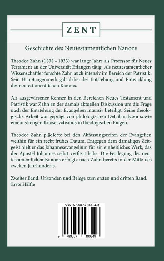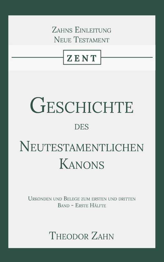 Theodor Zahn (1838 - 1933) war lange Jahre als Professor für Neues Testament an der Universität Erlangen tätig. Als neutestamentlicher Wissenschaftler forschte Zahn auch intensiv im Bereich der Patristik. Sein Hauptaugenmerk galt dabei der Entstehung und Entwicklung des neutestamentlichen Kanons.
