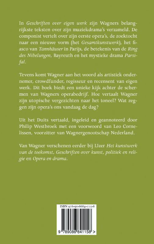In Geschriften over eigen werk zijn Wagners belangrijkste teksten over zijn muziekdrama's verzameld. De componist vertelt over zijn eerste opera's, de zoektocht naar een nieuwe vorm (het Gesamtkunstwerk), het fiasco van Tannhäuser in Parijs, de betekenis van de Ring des Nibelungen, Bayreuth en het mystieke drama Parsifal.