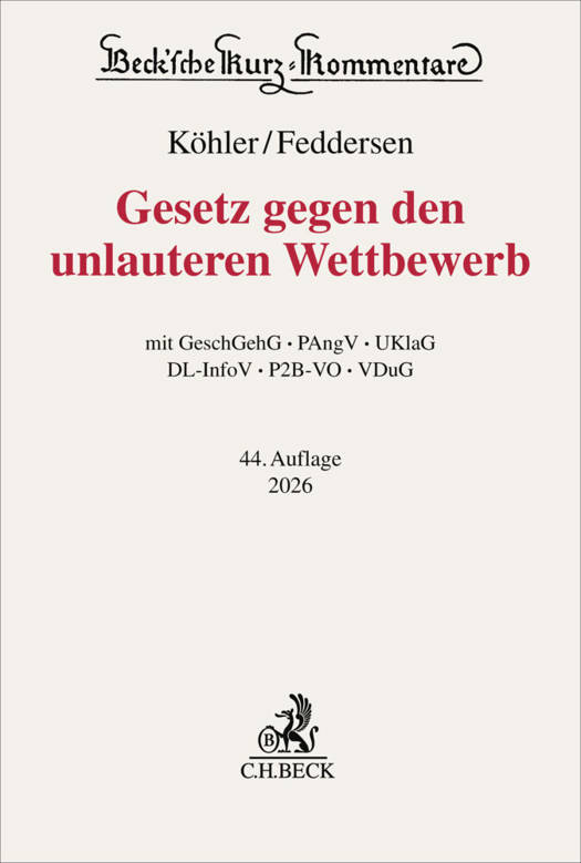 Zum WerkDer Köhler/Feddersen gilt als unverzichtbares Standardwerk. Kommentiert sind neben dem UWG das Geschäftsgeheimnisgesetz (GeschGehG), die Preisangabenverordnung (PAngV), das Gesetz über Unterlassungsklagen bei Verbraucherrechts- und anderen Verstößen (UKlaG), die Dienstleistungs-Informationspflichten-Verordnung (DL-InfoV), die Verordnung (EU) 2019/1150 zur Förderung von Fairness und Transparenz für gewerbliche Nutzer von Online-Vermittlungsdiensten (P2B-VO) und das VDuG.