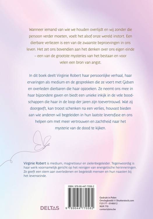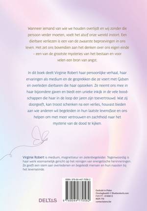 In dit boek deelt Virginie Robert haar persoonlijke verhaal, haar ervaringen als medium en de gesprekken die ze voert met Gidsen en overleden dierbaren die haar opzoeken. Ze neemt ons mee in haar bijzondere gaven en biedt een unieke inkijk in de vele boodschappen die haar in de loop der jaren zijn toevertrouwd. Wat zij doorgeeft kan troost schenken na een verlies, houvast bieden aan wie anderen wil begeleiden in hun laatste levensfase en ons helpen om met meer vertrouwen en zachtheid naar het mysterie van de dood te kijken.