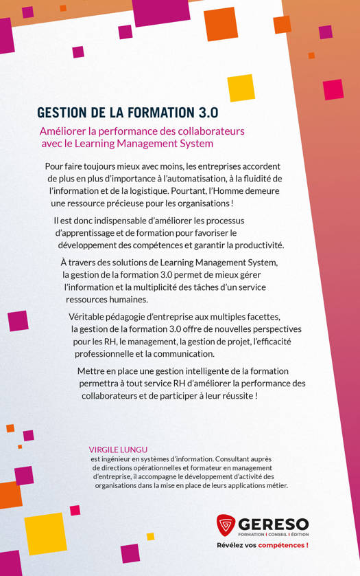 Véritable pédagogie d’entreprise aux multiples facettes, la gestion de la formation 3.0 offre de nouvelles perspectives pour les RH, le management, la gestion de projet, l’efficacité professionnelle et la communication.