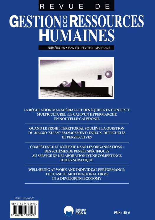 1/ La régulation managériale et des équipes en contexte multiculturel : le cas d'un hypermarché en Nouvelle-Calédonie 2/ Quand le projet territorial soulève la question du macro-talent management : enjeux, difficultés et perspectives. 3/ Compétence et dyslexie dans les organisations : des schèmes de pensée spécifiques au service de l'élaboration d'une compétence idiosyncratique. 4/ Well-being at work and individual performance : the case of multinational firms in a developping economy