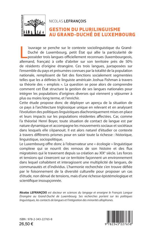 L’ouvrage se penche sur le contexte sociolinguistique du Grand-Duché de Luxembourg, petit État qui allie la particularité de posséder trois langues officiellement reconnues (luxembourgeois, allemand, français) à celle d’abriter sur son territoire près de 50% de résidents d’origine étrangère. Ces trois langues, juxtaposées sur l’ensemble du pays et présumées connues par la totalité de la population nationale, remplissent de fait des fonctions socialement segmentées telles que les a définies le linguiste américain Joshua Fishman à travers sa théorie des « emplois ». La question se pose alors de comprendre comment cet État structure la gestion de ses langues nationales pour intégrer les populations d’origines diverses qui viennent y séjourner et l’enrichir. Cette étude propose donc de déployer un aperçu de la situation du Luxembourg en relevant et en analysant l’évolution des politiques linguistiques diachroniquement mises en place et leurs impacts sur les populations résidentes affectées. Car, comme l’a théorisé Henri Boyer, toute situation de contact de langue est par nature dynamique et accompagne les mouvements sociaux et sociétaux dans lesquels elle s’épanouit. Il est alors naturel d’étudier ce contexte à travers différents prismes pour en saisir toute la richesse : historique, linguistique, sociopolitique. Le Luxembourg offre donc à l’observateur une « écologie » linguistique complexe qui se révèle être un cas d’étude, non dénué de tensions, mais d’une richesse épisté