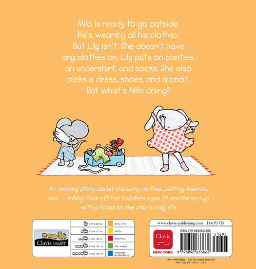 Milo is ready to go outside. He's wearing all his clothes. But Lily isn't. She doesn't have any clothes on. Lily puts on panties, an undershirt, and socks. She also picks a dress, and a coat. But what's Milo doing?