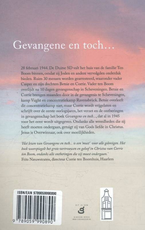 28 februari 1944. De Duitse SD valt het huis van de familie Ten Boom binnen, omdat zij Joden en andere vervolgden onderdak bieden. Ruim 30 mensen worden gearresteerd, waaronder vader Casper en zijn dochters Betsie en Corrie. Vader ten Boom overlijdt na 10 dagen gevangenschap in Scheveningen. Betsie en Corrie brengen maanden door in de gevangenis te Scheveningen, kamp Vught en concentratiekamp Ravensbrück. Betsie overleeft dit concentratiekamp niet, maar Corrie wordt vrijgelaten en schrijft over de eerste oorlogsjaren, het verzet en de ontberingen in gevangenschap het boek Gevangene en toch..., dat al in 1945 voor het eerst wordt uitgegeven. Ondanks alle wreedheden die zij heeft moeten ondergaan, getuigt zij van Gods liefde in Christus. Jezus is Overwinnaar, ook over moeilijkheden.