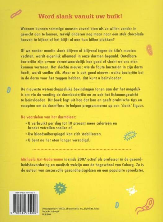 Waarom kunnen sommige mensen zoveel eten als ze willen zonder in gewicht aan te komen, terwijl anderen nog maar naar een stuk chocolade hoeven te kijken of het blijft al aan hun billen plakken? Of we zonder moeite slank blijven of blijvend tegen de kilo's moeten vechten, wordt eigenlijk allemaal in onze darmen bepaald. Ontelbare bacteriën zijn ervoor verantwoordelijk hoe goed of slecht we ons eten kunnen verteren. Het slechte nieuws: wie de foute bacteriën in zijn darm heeft, wordt sneller dik. Maar er is ook goed nieuws: welke bacteriën het in de darm voor het zeggen hebben, dat kunt u beïnvloeden. De nieuwste wetenschappelijke bevindingen tonen aan dat het mogelijk is om via de voeding de darmbacteriën en zo ook het lichaamsgewicht te beïnvloeden. Dit boek legt uit hoe dat kan en geeft praktische tips en recepten om de darmflora te helpen programmeren op een 'slank' figuur.