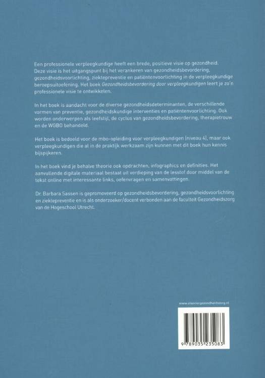 Een professionele verpleegkundige heeft een brede, positieve visie op gezondheid. Deze visie is het uitgangspunt bij het verankeren van gezondheidsbevordering, gezondheidsvoorlichting, ziektepreventie en patiëntenvoorlichting in de verpleegkundige beroepsuitoefening. Het boek'Gezondheidsbevordering door verpleegkundigen'leert je zo'n professionele visie te ontwikkelen