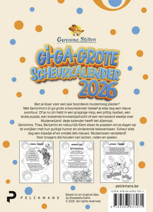 Ben je klaar voor een jaar vol muizenissig plezier? Met Geronimo's gi-ga-grote scheurkalender beleef je elke dag een nieuw avontuur. Of je nu zin hebt in een grappige mop, een pittig raadsel, een leuke puzzel of een verrassend weetje over Muizeneiland: je vindt het allemaal in deze kalender.