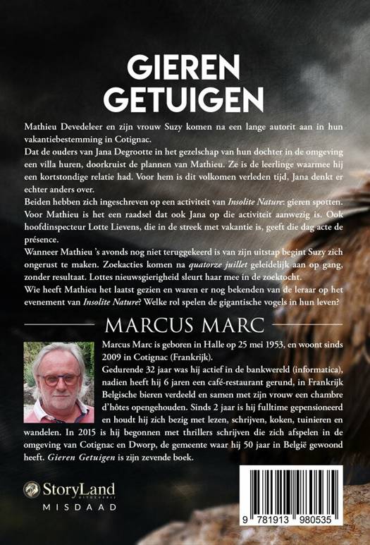 Marcus Marc is geboren in Halle op 25 mei 1953, en woont sinds 2009 in Cotignac (Frankrijk). Gedurende 32 jaar was hij actief in de bankwereld (informatica), nadien heeft hij 6 jaren een café-restaurant gerund, in Frankrijk Belgische bieren verdeeld en samen met zijn vrouw een chambre d’hôtes opengehouden. Sinds 2 jaar is hij fulltime gepensioneerd en houdt hij zich bezig met lezen, schrijven, koken, tuinieren en wandelen. In 2015 is hij begonnen met thrillers schrijven die zich afspelen in de omgeving van Cotignac en Dworp, de gemeente waar hij 50 jaar in België gewoond heeft. Gieren Getuigen is zijn zevende boek.