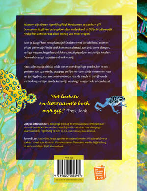 Goeie vraag: waarom zijn dieren eigenlijk giftig? Hoe komen ze aan hun gif? En waarom is gif veel belangrijker dan we denken? Er is nog zoveel te leren over gif: over het gevaar, maar ook over de genezende krachten en het belang voor overleven. Het volledige kleurige register wordt opengetrokken in dit boek: bonte slangen, heftige wespen met hun gifangels, felgekleurde kikkers, padden met hun wrattige huid en sierlijke lichtgevende kwallen. De wereld van gif is namelijk ook een heel spetterende, knetterende en kleurrijke wereld.