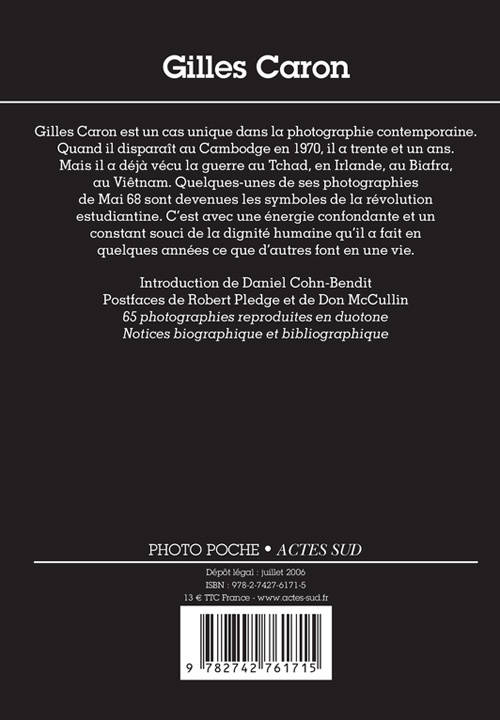 Gilles Caron est un cas unique dans la photographie contemporaine. Quand il meurt à trente et un ans au Cambodge, il a déjà suivi la guerre au Tchad, en Irlande, au Biafra, et au Vietnam. Ses photographies de Mai 68 sont devenues les symboles de la révolution estudiantine. C'est avec une énergie confondante et un constant souci de la dignité humaine qu'il a fait en quelques années ce que d'autres font en une vie.