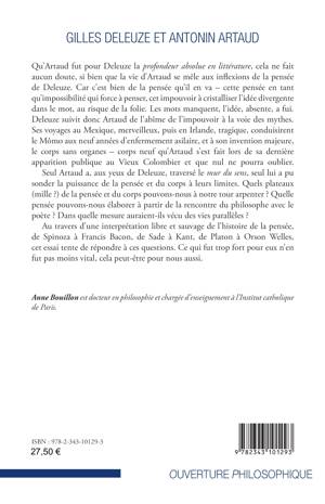 Artaud fut pour Deleuze la "profondeur absolue en littérature". Tous deux partagent justement une conception de la pensée originale, tout à la fois impossible et imprévisible, jumelle de la folie. Les voyages d'Artaud au Mexique, solaire et merveilleux, puis en Irlande, tragique, le condamnèrent à neuf années d'enfermement asilaire. Seul Artaud a, aux yeux de Deleuze, traversé le "mur du sens" : il serait le seul à avoir sondé la puissance de la pensée et du corps. Quels plateaux de la pensée et du corps pouvons-nous à notre tour arpenter ? Quelle pensée pouvons-nous élaborer à partir de la rencontre du philosophe avec le poète ?