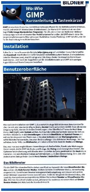 Diese Kurzanleitung enthält die wichtigsten Informationen zur Bildbearbeitung in GIMP. Die praktische Faltkarte enthält die wichtigsten Tastaturkürzel zum Bearbeiten und Erstellen von Bildern und erklärt die wichtigsten Funktionen in bündiger und übersichtlicher Form.