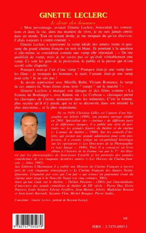 Ginette Leclerc a représenté la vamp idéale des années trente et quarante du grand cinéma français en noir et blanc. Considérée comme une vamp, elle a marqué son époque et des films comme " La Femme du Boulanger " avec Raimu, ou " Le Corbeau ". C'est la femme, plus secrète qu'il n'y paraît, qui va ici se découvrir, dans son intimité la plus méconnue… et la plus surprenante.