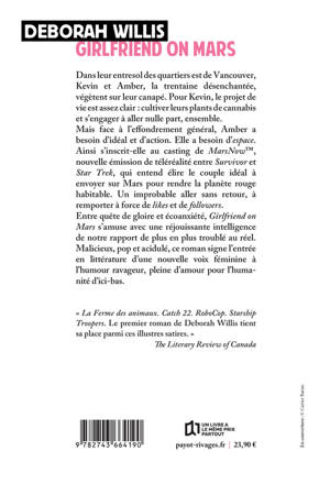 Satirique, pop et acidulé, "Girlfriend on Mars" signe l'entrée en littérature d'une nouvelle voix féminine euphorisante à l'humour dévastateur, pleine d'amour pour l'humanité d'ici bas. A travers des personnages aussi drôles qu'attachants, avec un rythme et un sens des dialogues dignes des meilleures séries, Deborah Willis dresse une satire super maligne de notre rapport modifié au réel dans une société de plus en plus fake, et pose un regard tendre sur nos fragiles éthiques individuelles. Entre quête de gloire et crise environnementale, ce roman pourrait bien être le manifeste ultramoderne d'une nouvelle génération contrainte d'adapter ses ambitions à l'ère des réseaux sociaux et de l'éco-anxiété.