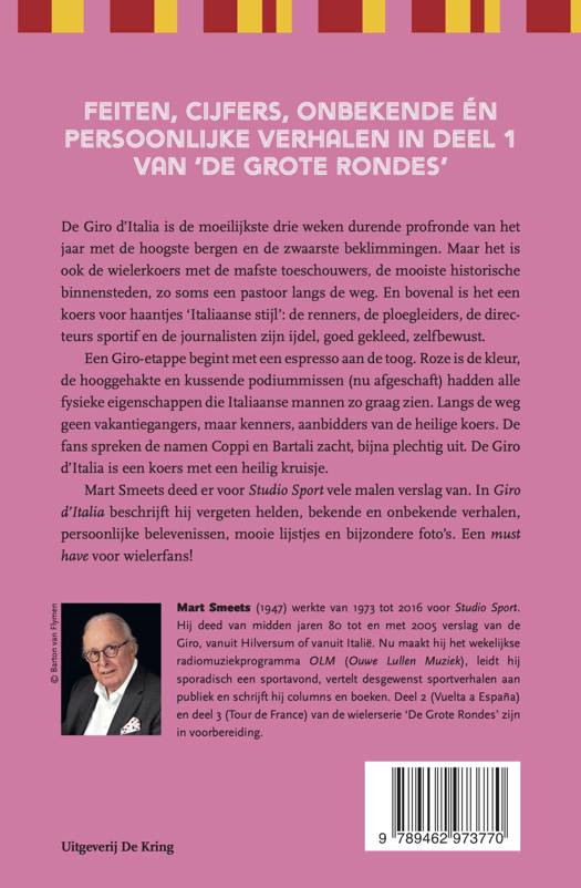 De Giro d’Italia is de moeilijkste drie weken durende profronde van het jaar met de hoogste bergen en de zwaarste beklimmingen. Maar het is ook de wielerkoers met de mafste toeschouwers, de mooiste historische binnensteden, zo soms een pastoor langs de weg. En bovenal is het een koers voor haantjes ‘Italiaanse stijl’: de renners, de ploegleiders, de directeurs sportif en de journalisten zijn ijdel, goed gekleed, zelfbewust. Een Giro-etappe begint met een espresso aan de toog. Roze is de kleur, de hooggehakte en kussende podiummissen (nu afgeschaft) hadden alle fysieke eigenschappen die Italiaanse mannen zo graag zien. Langs de weg geen vakantiegangers, maar kenners, aanbidders van de heilige koers. De fans spreken de namen Coppi en Bartali zacht, bijna plechtig uit. De Giro d’Italia is een koers met een heilig kruisje. Mart Smeets deed er voor Studio Sport vele malen verslag van. In GIRO D'ITALIA beschrijft hij vergeten helden, bekende en onbekende verhalen, persoonlijke belevenissen, mooie lijstjes en bijzondere foto’s. Een must have voor wielerfans!