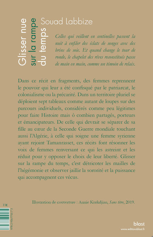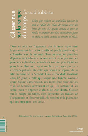 Dans ce « récit en fragments », comme le nomme l'autrice, des femmes reprennent le pouvoir qui leur a été confisqué par le patriarcat, le colonialisme ou la précarité. Dans un territoire pluriel se déploient sept tableaux comme autant de loupes sur des parcours individuels, considérés comme peu légitimes pour faire Histoire mais ô combien partagés, porteurs et émancipateurs. De celle qui devrait se séparer de son enfant au coeur de la Seconde Guerre mondiale touchant aussi l'Algérie, à celle traversant la frontière pour aller avorter en pleine révolution tunisienne, en passant par celle qui soigne une femme syrienne ayant réussi à rejoindre Tamanrasset, ces récits en écho font résonner les voix de femmes qui renversent ce qui les astreint et les réduit et font le choix de leur liberté. Glisser sur la rampe du temps, c'est détricoter les mailles de l'hégémonie et observer jaillir la sororité et la puissance qui accompagnent ces vécus.