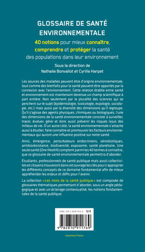 Les sources des maladies peuvent être d’origine environnementale, tout comme des bienfaits pour la santé sont apportés par la connexion avec l’environnement. Cette relation établie entre santé et environnement est maintenant devenue un champ scientifique à part entière. Non seulement par la pluralité des sciences qui se penchent sur le sujet (épidémiologie, toxicologie, expologie, sociologie, etc.) mais aussi par la diversité des dimensions qu’il regroupe. Que ce soient des agents physiques, chimiques ou biologiques, l’une des dimensions de la santé environnementale consiste à surveiller, tracer, évaluer, gérer et donc aussi prévenir les risques issus des milieux de vie. D’un autre côté, la santé environnementale s’attache aussi à étudier, faire connaître et promouvoir les facteurs environnementaux qui auront une influence positive sur notre santé. Ainsi, émergence, perturbateurs endocriniens, xénobiotiques, antibiorésistance, biodiversité, exposome, santé planétaire, Une seule santé (One Health) comptent parmi les 40 termes à connaître, que ce glossaire de santé environnementale permettra d'aborder. Étudiants, professionnels de santé publique mais aussi collectivités et citoyens trouveront dans cet ouvrage les clés pour s'approprier les différents concepts de ce domaine fondamental afin de mieux appréhender les enjeux et défis pour l’avenir. La collection « Les mots de la santé publique » est composée de glossaires thématiques permettant d’aborder, sous un angle pédagogique et avec un éclairage contextualisé, les notions fondamentales de la santé publique.