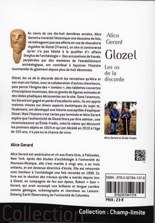 Le site de Glozel est situé dans l'Allier, à une trentaine de kilomètres de Vichy. Il est devenu célèbre à partir de 1924, quand fut mis au jour un ensemble d'objets, attribués dans un premier temps à une époque préhistorique mais dont l'ancienneté et parfois l'authenticité furent rapidement contestées. Les objets découverts sont des pierres taillées, des poteries, des ossements, des tablettes gravées... portant des inscriptions évoquant une écriture dans un alphabet souvent rapproché de l'alphabet phénicien. Ces vestiges sont à l'origine d'une vive controverse qui divisa une partie de la communauté scientifique, puis le grand public, en «glozéliens» et «anti-glozéliens». L'«affaire Glozel», qualifiée «d'affaire Dreyfus de l'archéologie», connut de nombreux épisodes judiciaires. Au cours de ces dernières années, Alice Gerard a traversé l'Atlantique une douzaine de fois, ne ménageant pas ses efforts en vue de résoudre le mystère de Glozel. Ce livre décrit les tentatives d'Alice Gerard et de son mari pour percer l'énigme des « tombes », tablettes, os gravés et autres idoles phalliques. Les Gerard ont au final développé une théorie susceptible d'expliquer Glozel tout en espérant que l'authenticité du site finira par être admise.