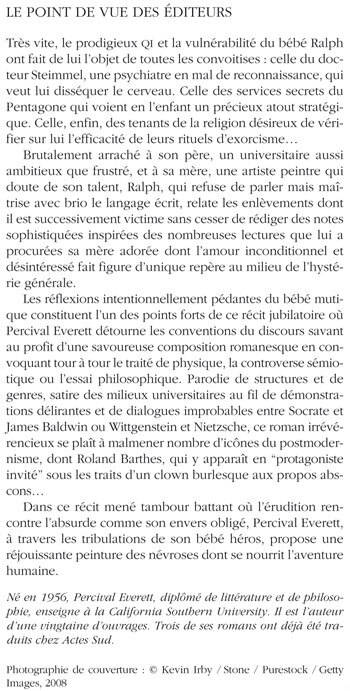 Très vite, le prodigieux QI et la vulnérabilité du bébé Ralph ont fait de lui l'objet de toutes les convoitises : celle du docteur Steimmel, une psychiatre en mal de reconnaissance, qui veut lui disséquer le cerveau. Celle des services secrets du Pentagone qui voient en l'enfant un précieux atout stratégique. Celle, enfin, des tenants de la religion désireux de vérifier sur lui l'efficacité de leurs rituels d'exorcisme... Brutalement arraché à son père, un universitaire aussi ambitieux que frustré, et à sa mère, une artiste peintre qui doute de son talent, Ralph, qui refuse de parler mais maîtrise avec brio le langage écrit, relate les enlèvements dont il est successivement victime sans cesser de rédiger des notes sophistiquées inspirées des nombreuses lectures que lui a procurées sa mère adorée dont l'amour inconditionnel et désintéressé fait figure d'unique repère au milieu de l'hystérie générale. Les réflexions intentionnellement pédantes du bébé mutique constituent l'un des points forts de ce récit jubilatoire où Percival Everett détourne les conventions du discours savant au profit d'une savoureuse composition romanesque en convoquant tour à tour le traité de physique, la controverse sémiotique ou l'essai philosophique. Parodie de structures et de genres, satire des milieux universitaires au fil de démonstrations délirantes et de dialogues improbables entre Socrate et James Baldwin ou Wittgenstein et Nietzsche, ce roman irrévérencieux se plaît à malmener nombre d'icônes du postmodernisme, dont Roland Barthes, qui y apparaît en "protagoniste invité" sous les traits d'un clown burlesque aux propos abscons... Dans ce récit mené tambour battant où l'érudition rencontre l'absurde comme son envers obligé, Percival Everett, à travers les tribulations de son bébé héros, propose une réjouissante peinture des névroses dont se nourrit l'aventure humaine.