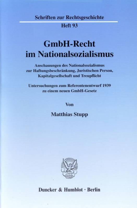 Matthias Stupp bettet den Entwurf in seine Entstehungsgeschichte ein, indem er die Entwicklungslinien des GmbH-Rechts seit 1892 und der Gesetzgebungsgeschichte seit 1933 nachzeichnet. Dabei bieten auch Verweise zur Geschichte des Aktiengesetzes von 1937 eine Hilfestellung. Im letzten Kapitel unterzieht der Autor den Entwurf sodann einer eingehenden Analyse. Als Ergebnis dieser Untersuchungen ist es möglich, nicht nur ein dem Nationalsozialismus eigenes Verständnis von einem auf völkischen Ideen aufbauenden Gesellschaftsrecht insgesamt nachzuzeichnen, sondern auch, die vordergründig vorhandene "sachliche Neutralität" des Entwurfs von 1939 zu widerlegen.