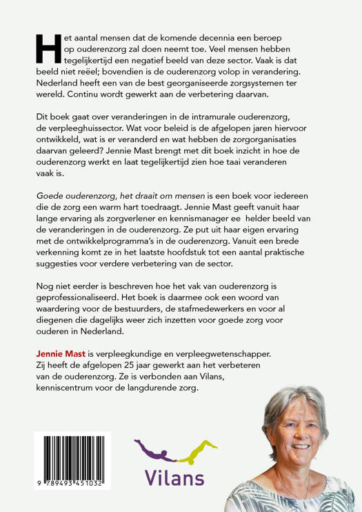 Goede ouderenzorg, het draait om mensen is een boek voor iedereen die de zorg een warm hart toedraagt. Jennie Mast geeft vanuit haar lange ervaring als zorgverlener en kennismanager ee helder beeld van de veranderingen in de ouderenzorg. Ze put uit haar eigen ervaring met de ontwikkelprogramma’s in de ouderenzorg. Vanuit een brede verkenning komt ze in het laatste hoofdstuk tot een aantal praktische suggesties voor verdere verbetering van de sector.