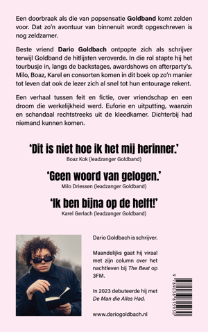 Beste vriend Dario Goldbach ontpopte zich als schrijver terwijl Goldband de hitlijsten veroverde. In die rol stapte hij het tourbusje in, langs de backstages, awardshows en afterparty’s. Milo, Boaz, Karel en consorten komen in dit boek op zo’n manier tot leven dat ook de lezer zich al snel tot hun entourage rekent.